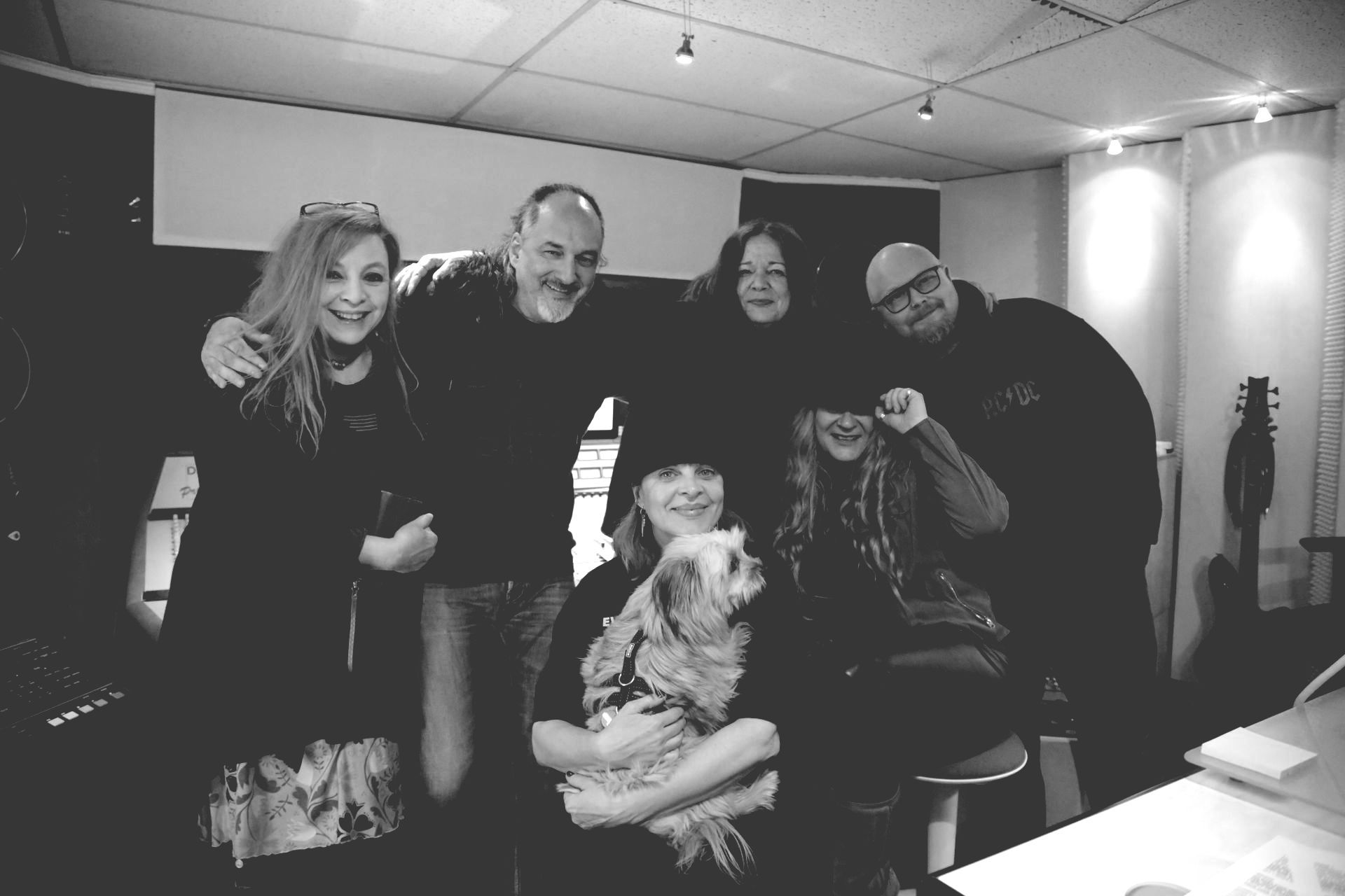 Bild 1 v. links: Tina Bichlmeir, Bobby Alvater (Sky Studio), Karin Manner, Claudia Cane, Andreas Kümmert, vorne: Miriam Dylan (Produzentin des Songs) mit Lizbeth, Claudia Cane